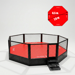 Клетка для боев без правил 7,0 метров в диаметре на помосте. Помост не выступает за габариты сетки. Форма клетки и помоста - восьмиугольник. В таких клетках проводят международные соревнования и тренировки любого уровня.