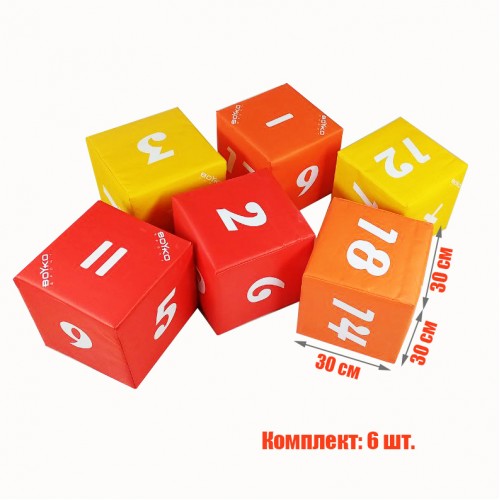 Набор из шести мягких кубиков с цифрами от 1 до 20 и математическими символами "+", "-", ":", "x", "=", ">".