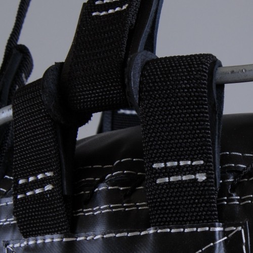 Узел крепления состоит из кольца по диаметру мешка, ремней и диска, что вращается.